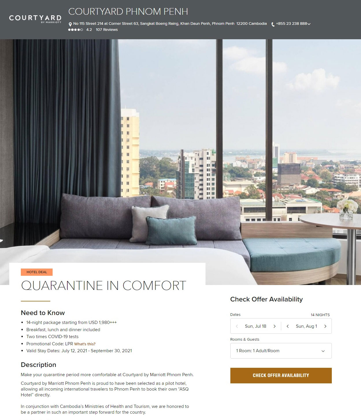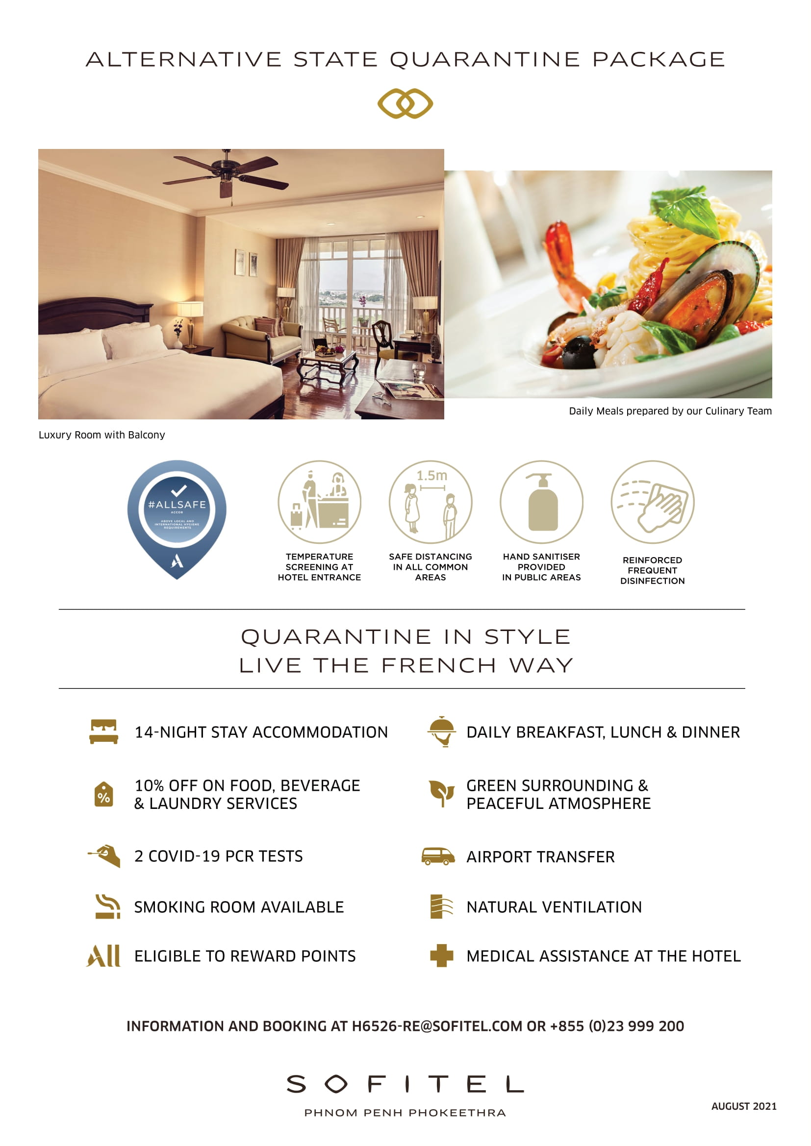- 上記ホテルでの隔離希望の場合、カンボジア入国時に、予約確認書の提出が必要 (※COVID-19陰性証明書及びFORTE保険購入証明書とともに)