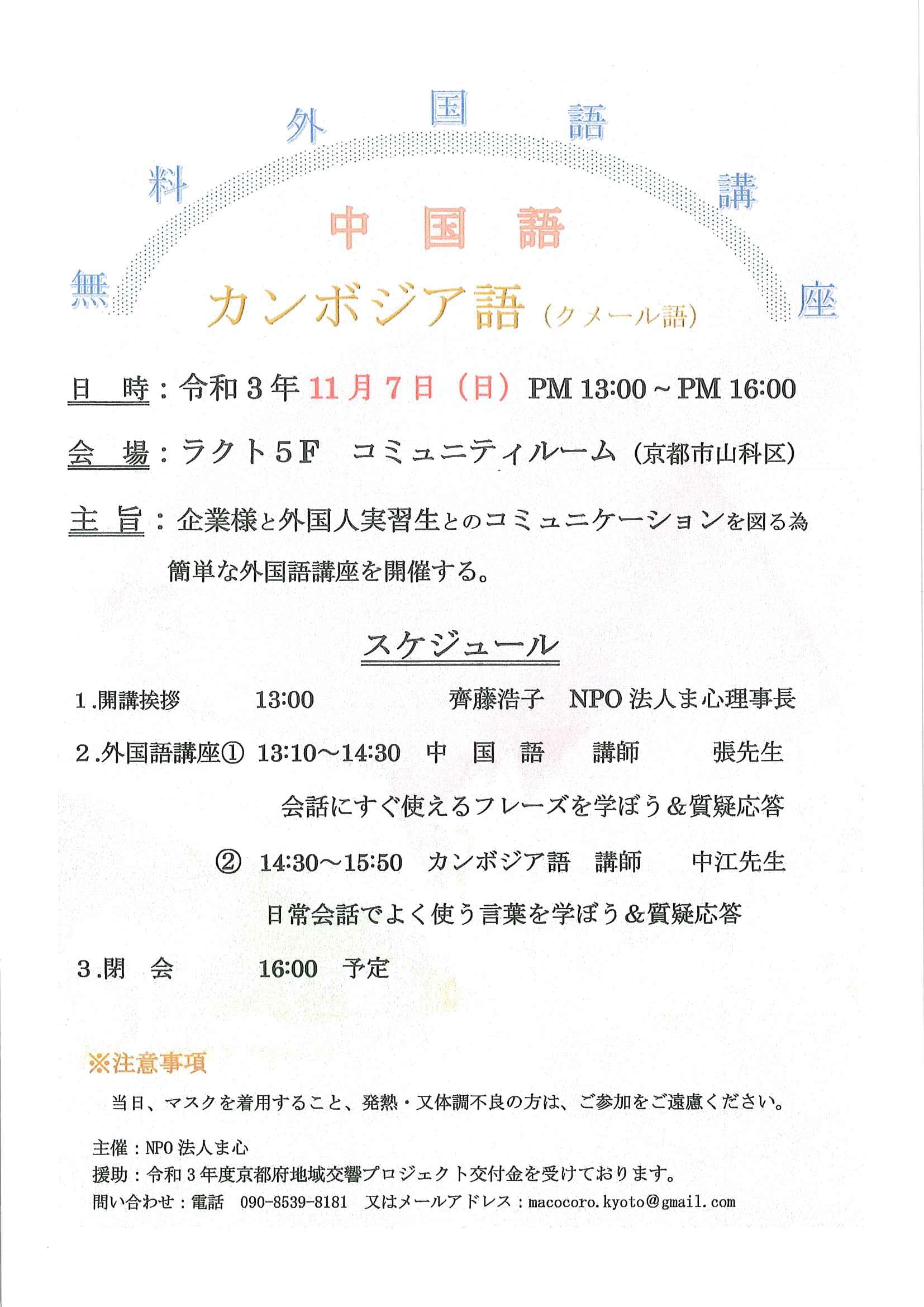 2)11月7日(日): NPO法人ま心「外国語講座(中国語&カンボジア語)」
