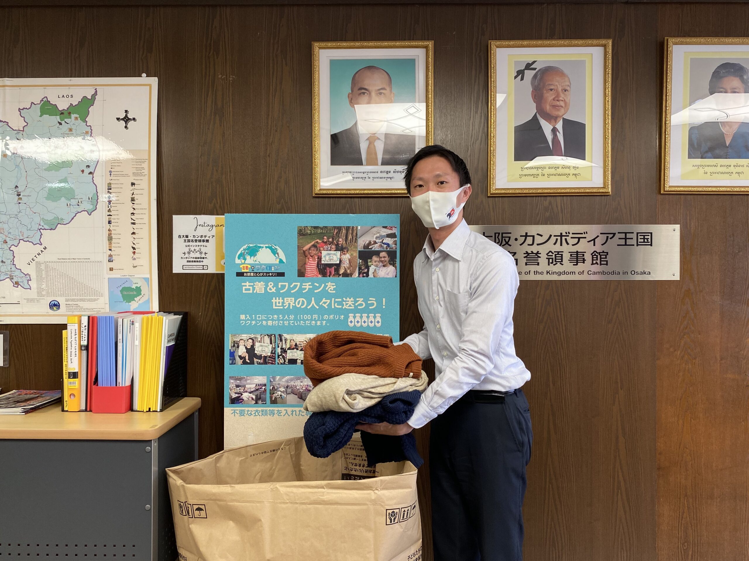 そして、現在カンボジアでも「古着deワクチン」プロジェクトが進行しています。今年の2月に、カンボジア・プノンペンで「古着deワクチン」事務所が新設され、11月には、「古着deワクチン」のカンボジア大型店舗「Jingi Japan」が開店しました。日本で集荷した古着はカンボジアへ出荷され、「Jingi Japan」店舗にて販売されます。またカンボジアの店舗では、ポリオの後遺症や障がい等を持つ方々が雇用されており、自立支援にも繋がっています。