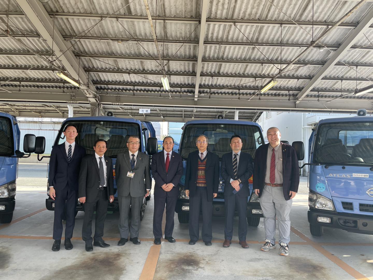 高橋副市長との会談後、Tuy Ry大使とHang Sochivin商業参事官は、大阪市環境局 西北環境事業センターにてゴミ収集車贈呈式に参加いたしました。今回のゴミ収集車贈呈は、2回目となり、前回2020年の寄贈と同じく、日本カンボジア協会のご尽力により、10台のゴミ収集車がカンボジアへ贈呈されました。