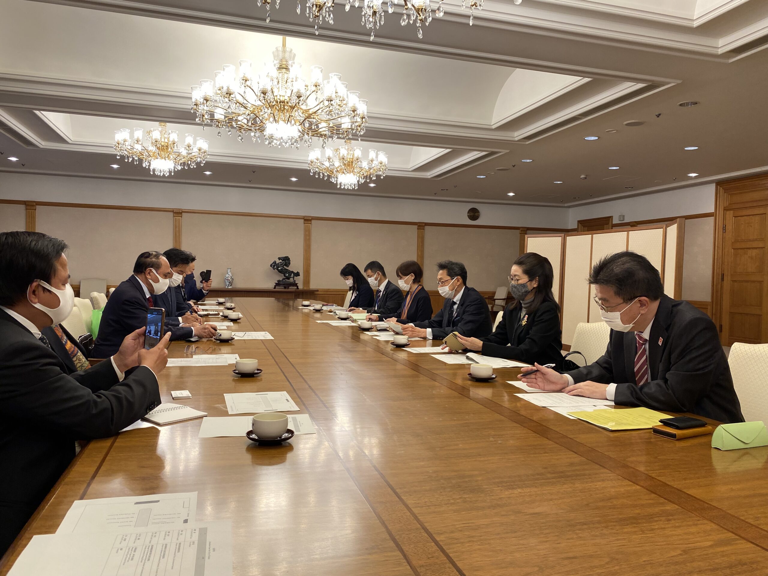 贈呈式の前に、Tuy Ry大使とHang Sochivin商業参事官は、一般社団法人日本カンボジア協会(JCA)会長の高橋 文明氏とともに、大阪市役所を訪問し、大阪市副市長の高橋 徹氏と会談を行いました。Tuy Ry大使からは、今回の大阪市からのゴミ収集車の寄贈に謝意が示されるとともに、カンボジアでは未だに環境問題が深刻であり、ゴミ問題解決のために、日本とさらに協力を深めていきたい旨述べました。また、Tuy Ry大使と高橋副市長は、来年の日・カンボジア外交関係樹立70周年、そして、2025年の大阪・関西万博に向けて、二国間関係の強化や地域情勢などについて意見交換を行いました。