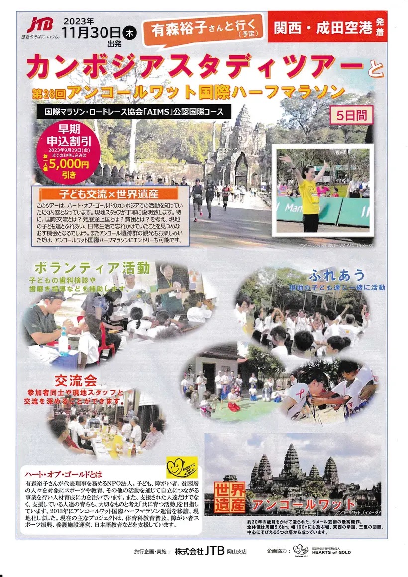 元女子マラソン選手、有森 裕子氏によって設立されたNPO法人Hearts of Gold(ハート・オブ・ゴールド)は、今年4年ぶりに「カンボジアスタディツアー(2023年11月30日~12月4日)」を実施されます。