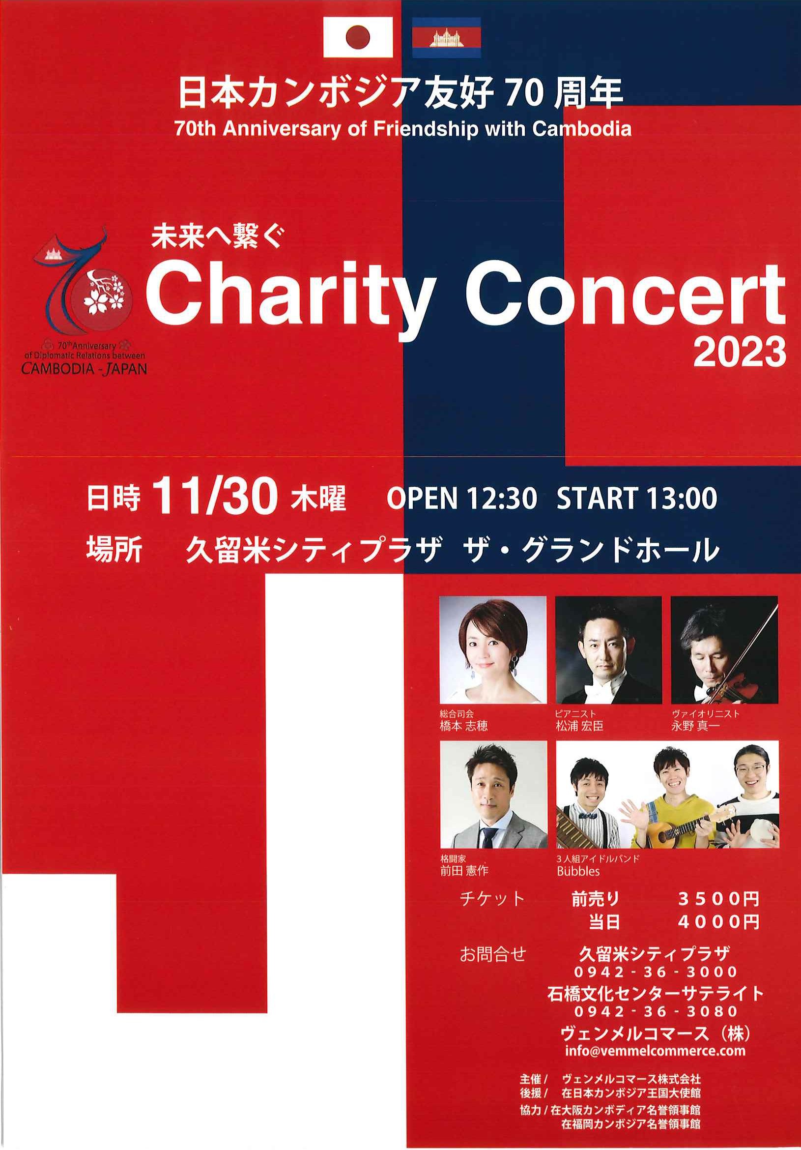 この度は、当館は、日本カンボジアの友好関係促進の一環といたしまして、2023年11月30日(木)に福岡県久留米市にて開催される予定の「日本カンボジア友好70周年チャリティーコンサート」へ協賛させていただきました。