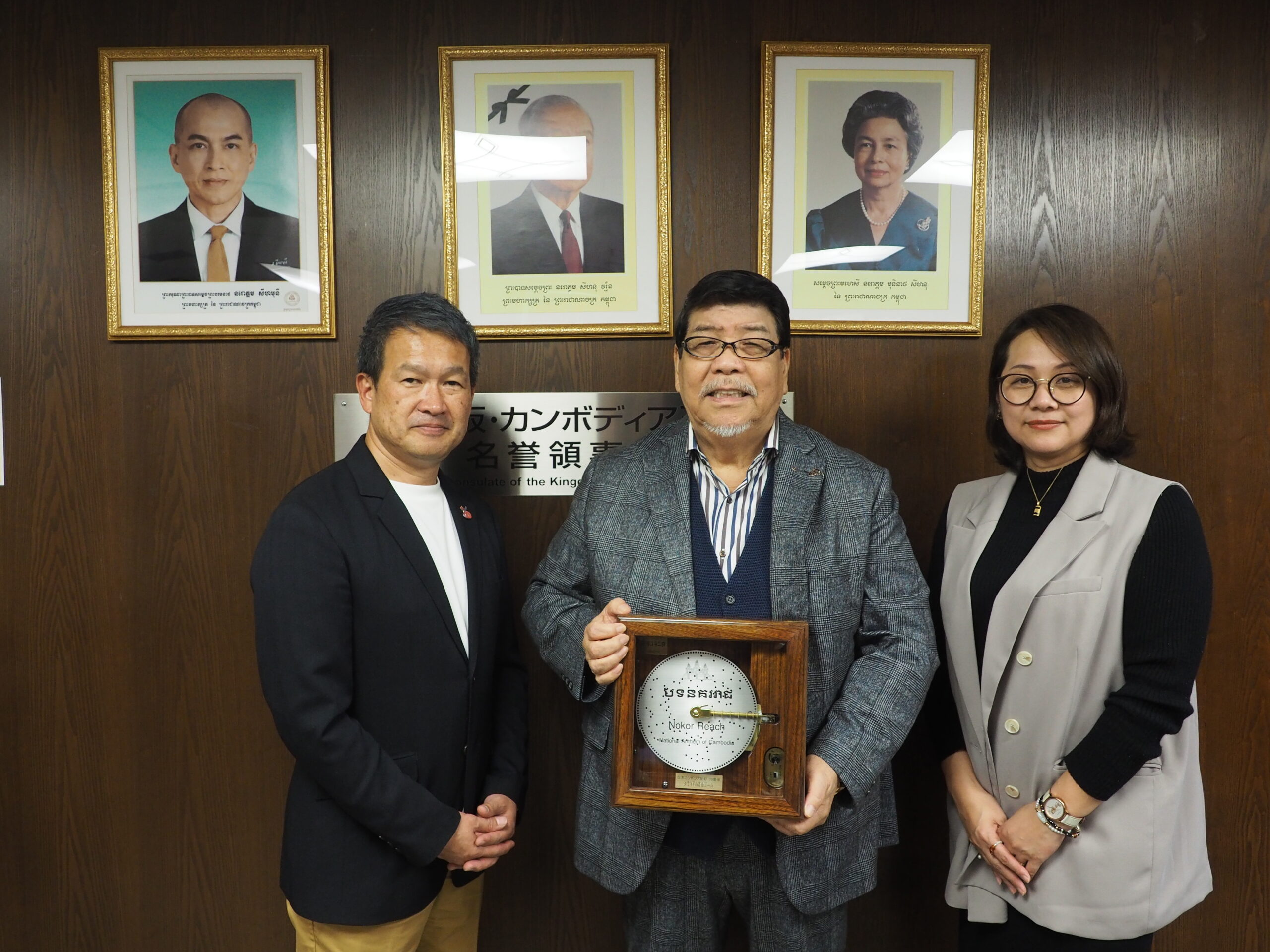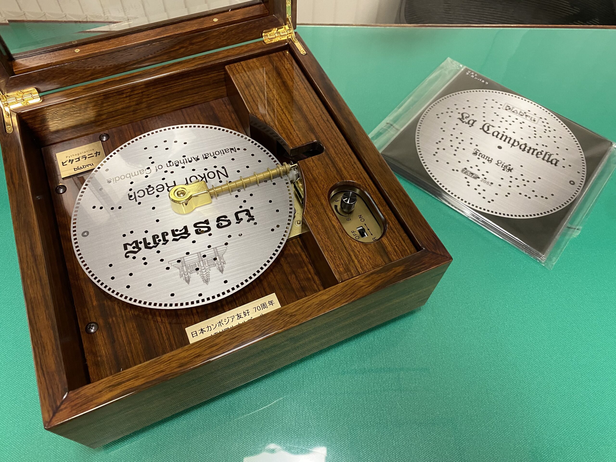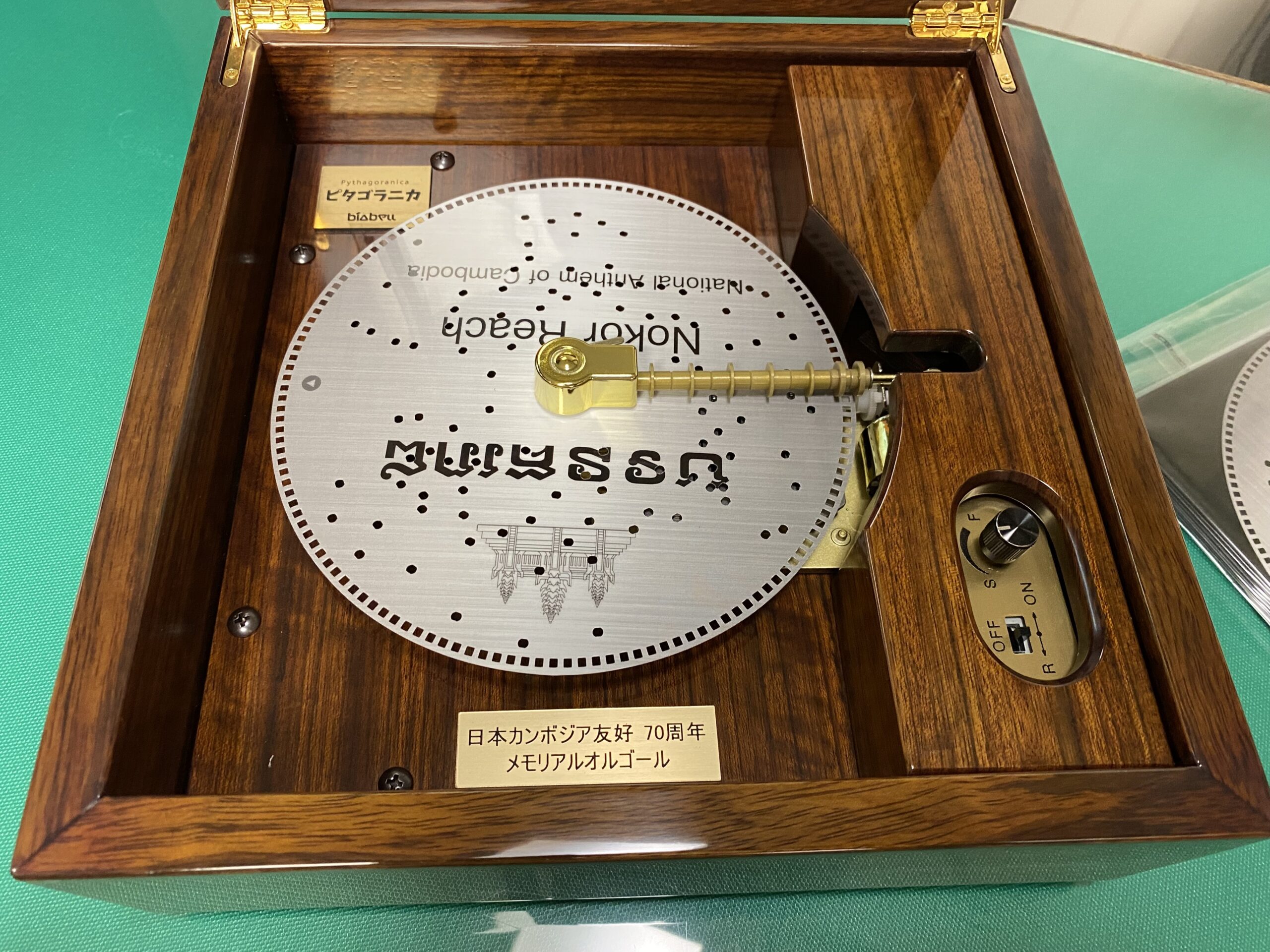 そして、今回の協力に対し、2023年11月17日(金)、チャリティーコンサート主催者「ヴェンメルコマース株式会社」の代表取締役、中村博文氏が来館され、当館の山田名誉領事へ特製の「日本カンボジア友好70周年」記念のオルゴールを贈呈されました。